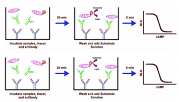 G蛋白是細(xì)胞內(nèi)的重要調(diào)控因子,參與細(xì)胞運(yùn)動(dòng)、代謝和轉(zhuǎn)錄等生理過程,它通過一系列膜結(jié)合受體觸發(fā)細(xì)胞內(nèi)的級聯(lián)反應(yīng)來參與調(diào)節(jié)各種細(xì)胞外信號。而調(diào)控G蛋白信號級聯(lián)反應(yīng)的關(guān)鍵是“第二信使”,即環(huán)磷酸腺苷(cAMP)和環(huán)磷酸鳥苷(cGMP)。這兩種分子的關(guān)鍵功能之一是激活鳥嘌呤交換因子(GEF),而GEF反過來又在G蛋白的活化中發(fā)揮作用。因此,檢測cAMP / cGMP水平,是研究細(xì)胞內(nèi)眾多信號通路必不可少的實(shí)驗(yàn)之一。美國Cell Biolabs公司提供了一種穩(wěn)定、高效的檢測cAMP/cGMP濃度的試劑盒,其采用競爭ELISA的方法,檢測靈敏度可達(dá)1 pmol/mL,并且試劑盒特異性強(qiáng),不與其他第二信使發(fā)生顯著交叉反應(yīng),適用于檢測的樣品類型廣泛,包括細(xì)胞/組織裂解液、唾液、尿液、血清和細(xì)胞上清等。