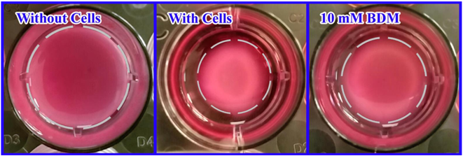 根據(jù)實驗方案(上圖),虛線表示凝膠邊緣,用尺子分別測量無細胞組、有細胞組和10mM細胞收縮抑制劑BDM處理組的膠原基質(zhì)的直徑(單位:mm),對比BDM處理組與對照組細胞收縮的變化。