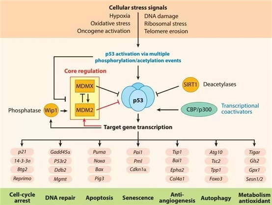 通常情況下,p53蛋白在正常細(xì)胞中壽命很短,表達(dá)水平也低。但在經(jīng)歷了基因損傷或致癌基因激活時,許多腫瘤細(xì)胞表達(dá)高水平的突變p53蛋白,在眾多調(diào)控通路中,磷酸化對p53蛋白活性的調(diào)節(jié)起關(guān)鍵作用,目前最廣泛被接受的觀點是:當(dāng)DNA損傷溫和且短暫時,p53主要發(fā)揮促進(jìn)生存(pro-survival)功能,比如促進(jìn)細(xì)胞周期停滯,促進(jìn)DNA修復(fù),降低活性氧,提高能量供應(yīng)等。當(dāng)DNA損傷難以修復(fù)時,p53則會促進(jìn)死亡(pro-death)的模式,比如誘導(dǎo)細(xì)胞衰老,凋亡或者鐵死亡等。