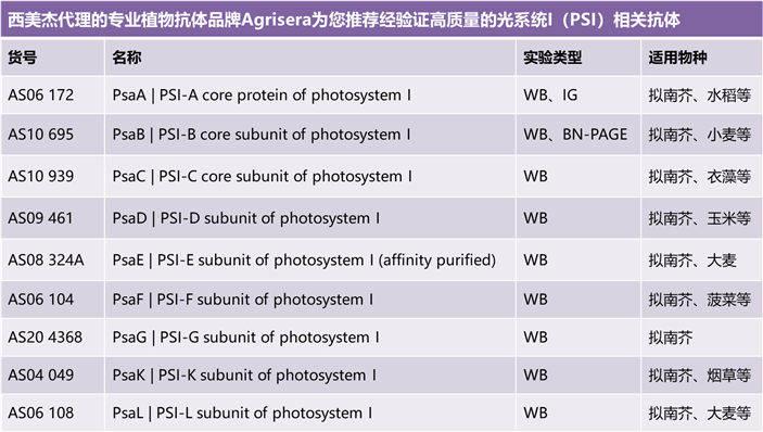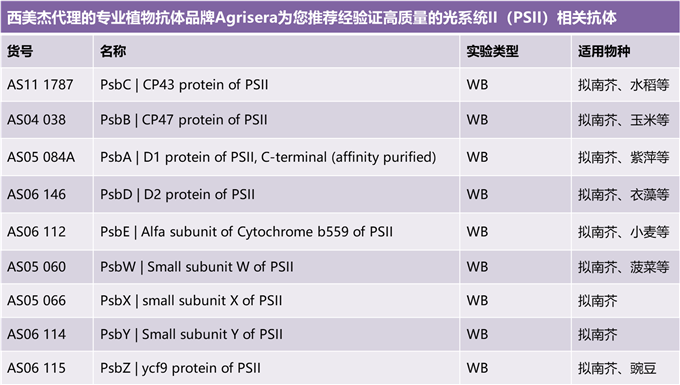 為滿足廣大光合作用研究方向客戶的需求,西美杰聯(lián)合專業(yè)抗體品牌Agrisera推出光系統(tǒng)PSI和PSII相關(guān)抗體促銷活動(dòng)!活動(dòng)內(nèi)容如下:
