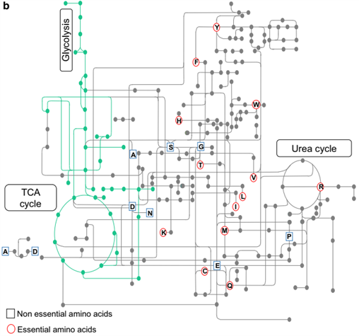 下圖展示了CHO細胞中氨基酸參與的細胞內(nèi)代謝途徑(綠色線條表示碳代謝途徑,單字母表示氨基酸)。
