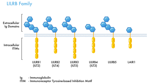 ? ? ? 白細胞免疫球蛋白樣受體 (The leukocyte immunoglobulin-like receptors, LILRs)?由抑制性LILR亞家族B(LILRB1-5)和激活性LILR亞家族A(LILRA1-6)組成。LILRB家族受體屬于I型跨膜糖蛋白,胞外區(qū)含有Ig樣結(jié)構(gòu)域,胞內(nèi)區(qū)含有免疫受體酪氨酸抑制基序(ITIM)結(jié)構(gòu)域,是免疫抑制性受體。LILRBs(LILRB1-5)主要在髓系細胞表達,同時在腫瘤干細胞上也高表達,并可能直接調(diào)控癌癥的發(fā)生和復發(fā)以及腫瘤干細胞的活性。LILRBs能抑制腫瘤免疫活性,并支持癌細胞在多種癌癥中存活,促進腫瘤生長和轉(zhuǎn)移。