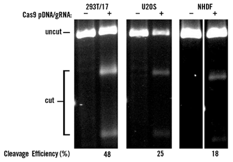 用TransIT-X2®分別在293T/17、U2OS和NHDF細(xì)胞中共轉(zhuǎn)Cas9質(zhì)粒DNA與gRNA實(shí)現(xiàn)了高效的基因編輯