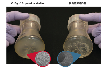 圖2. 使用Mirus CHOgro? High Yield Expression System中的CHOgro? Expression Medium進行培養(yǎng)(左),細胞結(jié)塊數(shù)量顯著少于其他培養(yǎng)基培養(yǎng)的CHO-S細胞(右)。