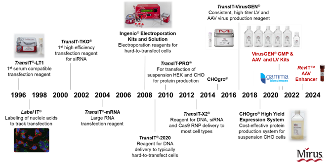 為什么Mirus TransIT-X2® Dynamic Delivery System有著如此高性能及廣泛適應(yīng)性呢?這歸因于Mirus強(qiáng)大且高效的專利遞轉(zhuǎn)平臺設(shè)計,可進(jìn)行多重、多功能組合的轉(zhuǎn)染試劑組分篩選并優(yōu)化。成立于1995年的Mirus,專注及深耕核酸遞轉(zhuǎn)領(lǐng)域多年(圖1),從最早具有低毒性的TransIT ® -LT1到GMP級別、可用于AAV和LV生產(chǎn)的TransIT-VirusGEN®,都是基于該遞轉(zhuǎn)平臺進(jìn)行設(shè)計及開發(fā)的。截至目前,使用Mirus產(chǎn)品發(fā)表文章已超過1萬篇,并且發(fā)表文章及Mirus數(shù)據(jù)庫涵蓋了超過1200種細(xì)胞類型,更多文章及數(shù)據(jù)查詢,請點(diǎn)擊這里。