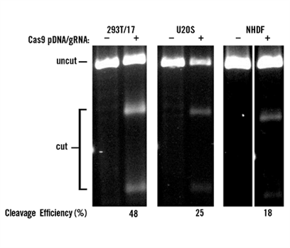 使用TransIT-X2® Dynamic Delivery System (2 μl/孔,24孔板, Mirus Bio)共轉(zhuǎn)染0.5 μg質(zhì)粒DNA(表達(dá)Cas9蛋白)及50nM 2-part gRNA (PPIB基因)至HEK293T/17, U2OS 及NHDF細(xì)胞中,轉(zhuǎn)染后48小時,T7E1驗證切割效率。