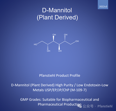 Pfanstiehl品牌D-甘露醇,秉承一貫高品質(zhì)理念,按照ICHQ7質(zhì)量體系生 產(chǎn),具有高純度,超低內(nèi)毒素,超低微生物含量的特點(diǎn),并單獨(dú)檢測(cè)29種金屬離子含量(ppb水平),符合多國(guó)藥典,滿(mǎn)足生物制藥和疫苗對(duì)于注射級(jí)別甘露醇的生產(chǎn)要求。