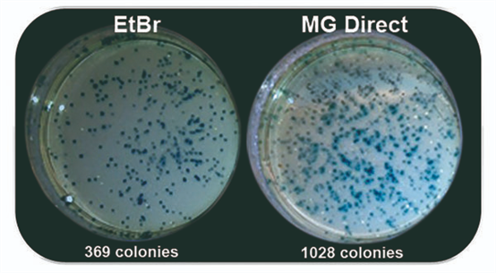 紫外光與EtBr染色至今仍一起被用于分子生物學實驗室中檢測核酸。然而紫外光譜會導致DNA樣品的修飾和降解,30秒的紫外線曝光足以大幅降低克隆效率。藍/綠LED在470 nm - 520 nm處發(fā)出安全可見光,這種光譜對 DNA 沒有破壞性,與紫外光相比,DNA完整性和克隆/測序效率完全不受影響,即使在長時間的光照下也是如此。MIDORIGreen系列核酸染料經過優(yōu)化,可在紫外光或藍/綠光激發(fā)時獲得更亮的信號,同時也兼容紫外光。