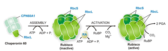 CO2的固定是利用光反應(yīng)產(chǎn)生的ATP和NADPH合成有機物的過程,該過程稱為卡爾文循環(huán)。1,5二磷酸核酮糖羧化/加氧酶(Rubisco)是CO2固定過程中的關(guān)鍵限速酶,催化CO2和RuBP(核酮糖-1,5-二磷酸)發(fā)生羧化、然后裂解形成兩個PGA(甘油酸-3-磷酸)分子。所有光合生物都具有由8個大亞基RbcL和8個小亞基Rbcs組成的I型Rubisco,且RbcL折疊到其天然狀態(tài)依賴于葉綠體定位的分子伴侶CPN60的作用。