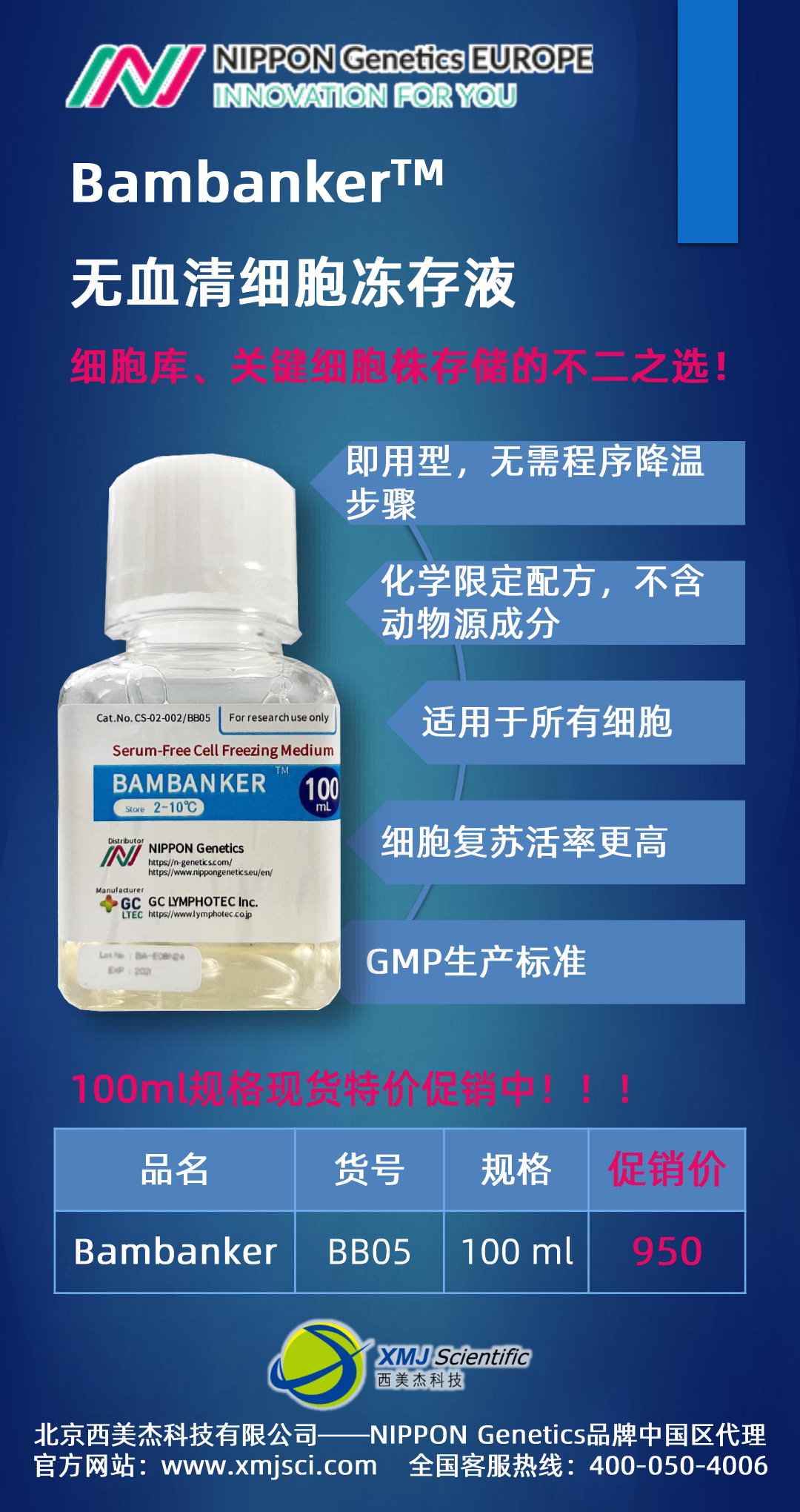 Bambanker?無(wú)血清細(xì)胞凍存液現(xiàn)貨促銷100ml特價(jià)950元