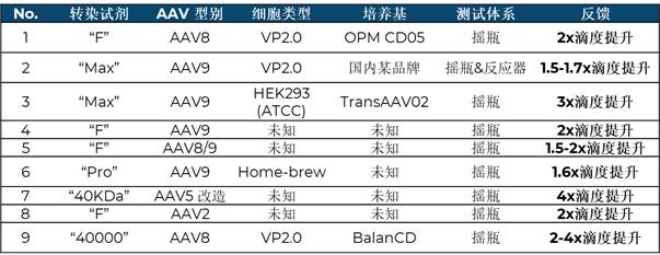 Mirus Bio成立于1996年,在核酸遞送領(lǐng)域深耕多年,于2021年8月推出GMP級別TransIT-VirusGEN® GMP 轉(zhuǎn)染試劑,支持AAV及LV從科研到GMP商業(yè)化生產(chǎn)。不同于傳統(tǒng)基于單組分的轉(zhuǎn)染試劑(如陽離子聚合物聚乙烯亞胺,PEI),Mirus Bio將專利的多聚物及脂質(zhì)技術(shù)進行多重組合,形成多功能性的轉(zhuǎn)染方案,克服細胞遞轉(zhuǎn)過程中的多重阻礙,以實現(xiàn)更高效轉(zhuǎn)染和更低細胞毒性,從而大幅度提升多種血清型AAV病毒生產(chǎn)載量。去年7月底Mirus上市RevIT? AAV Enhancer,已證明在不同AAV血清型別中,可提高AAV病毒基因組滴度1.2-4.9倍,并且在一定程度改善了實心率。更重要的是,RevIT? AAV Enhancer不僅可以搭配Mirus TransIT-VirusGEN® GMP 轉(zhuǎn)染試劑,也適配于其他轉(zhuǎn)染試(如PEI等),使得AAV生產(chǎn)上游成本的進一步降低成為可能,進而降低了基因治療單劑量成本。下圖展示了國內(nèi)客戶前期測試反饋結(jié)果,測試包括了不同血清型別的質(zhì)粒設(shè)計,適用于國內(nèi)及國外品牌的轉(zhuǎn)染試劑、細胞及培養(yǎng)基體系,實現(xiàn)了1.5-4倍以上的AAV病毒滴度提升。