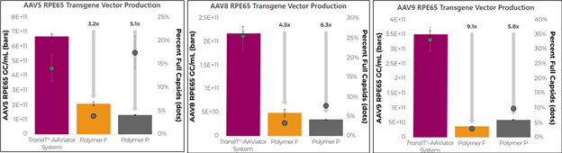 使用不同的質(zhì)粒設(shè)計(GFP基因-圖3;RPE65 基因-圖4),平行比較TransIT®-AAViator 轉(zhuǎn)染系統(tǒng)與“Poly F”(Polyplus FectoVIR® 病毒轉(zhuǎn)染試劑)以及“Poly P” (Polyplus PEIpro®病毒轉(zhuǎn)染試劑)。實驗結(jié)果顯示,在不同AAV血清型別中 (AAV5、8、9),TransIT®-AAViator 轉(zhuǎn)染系統(tǒng)有著更高的病毒滴度及實心率,當質(zhì)粒設(shè)設(shè)計替換成治療性基因(RPE65 基因),病毒滴度及實心率相比于競爭品牌,其優(yōu)勢更加顯著。
