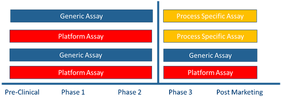 USP<1132>提到在沒有平臺化方法的情況下可以在臨床前、臨床I期、II期使用商品化試劑盒;在臨床III期/工藝驗證及產(chǎn)品上市后,由于商業(yè)化的通用HCP檢測試劑盒抗體的覆蓋率往往不足等局限性,需要考慮結(jié)合細(xì)胞類型及工藝特異性等因素,使用平臺化方法或針對上游工藝開發(fā)的產(chǎn)品/工藝專屬性方法。