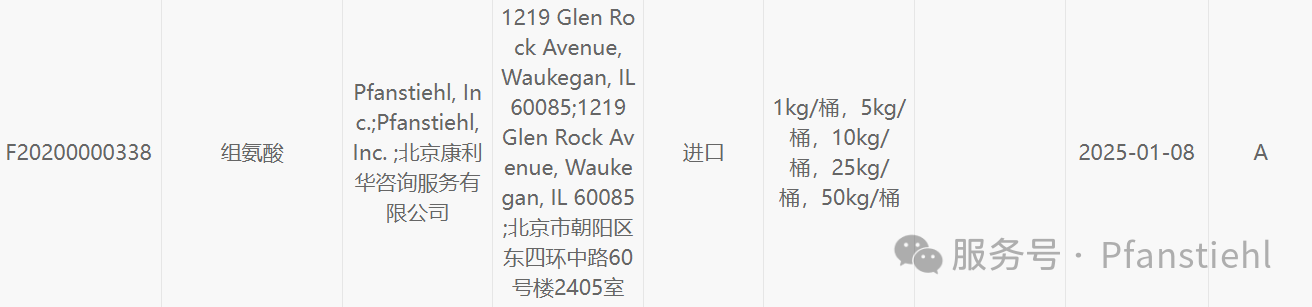Pfanstiehl is welcoming a spate of good news in the New Year. Following the recent activation of its injectable-grade arginine, the much-anticipated CDE registration number F20200000338 for injectable-grade Histidine (H-116) has finally been activated and upgraded to "Category A".